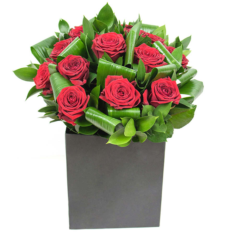 Discover the perfect blend of passion and refinement with our stunning bouquet. Dominated by vibrant red roses and accented with beautifully lush aspidistra leaves and subtle ruscus, this arrangement is an ode to natural elegance. Each flower is carefully hand-picked to guarantee unwavering freshness and lasting beauty.
