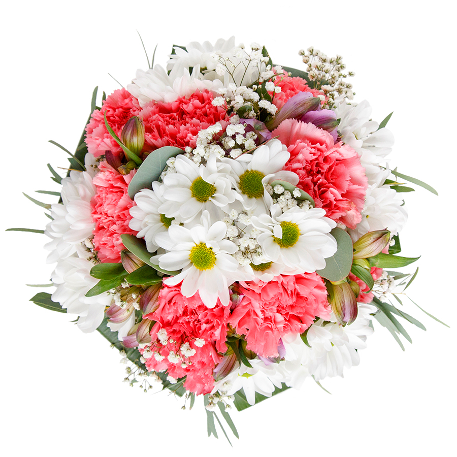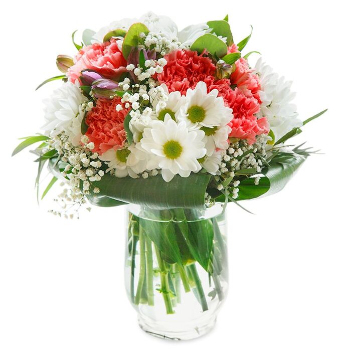 Delight in elegance with our stunning flower arrangement. This bouquet features a graceful combination of snow-white chrysanthemums, delicate gypsophila, and soft pink carnations, all beautifully arranged with vibrant aspidistra leaves.